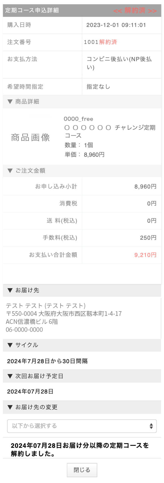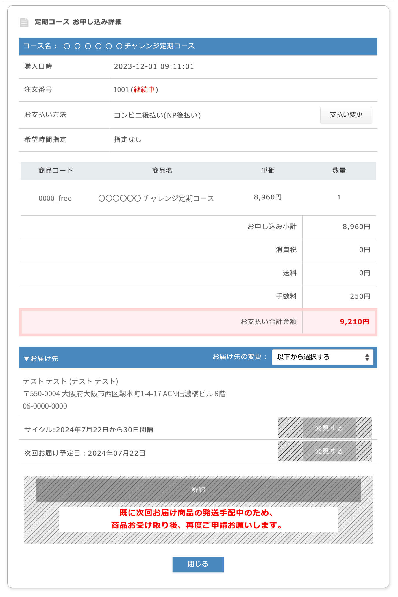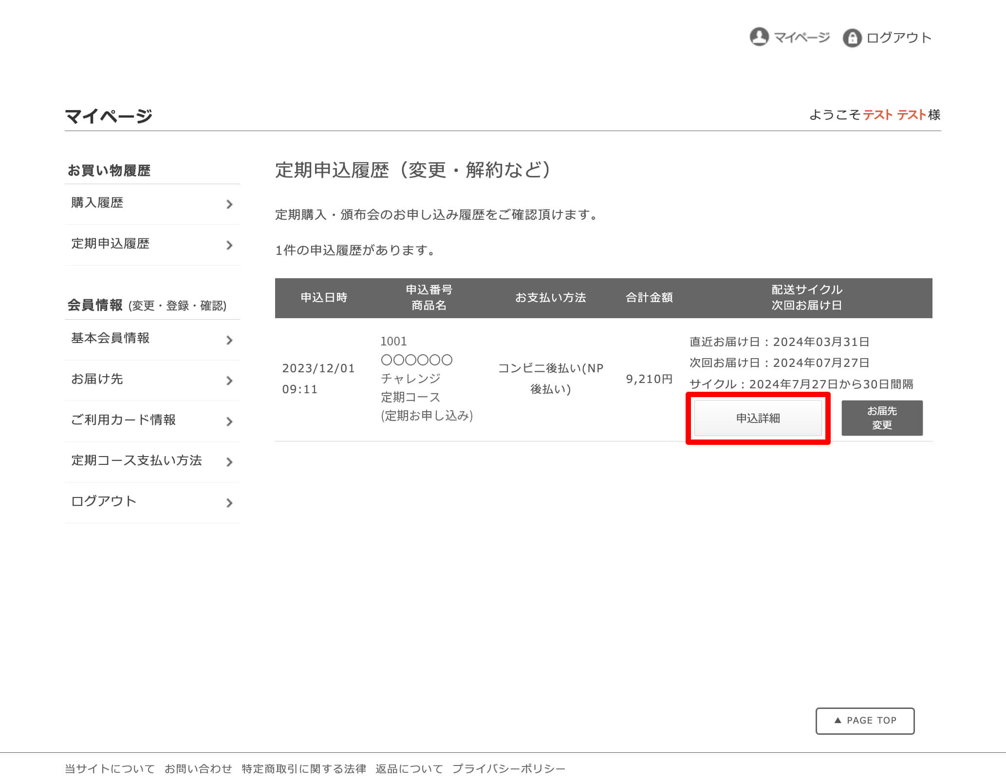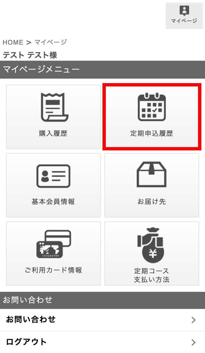 ②マイページにログインすると下記のような画面が表示されます。(もし表示されない場合は、左のお買い物履歴から定期申し込み履歴をクリックしてください。)