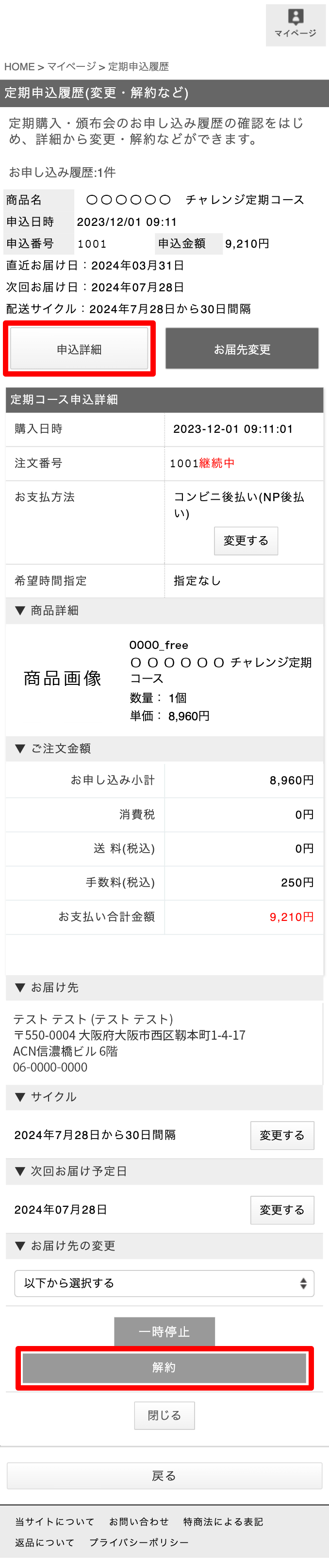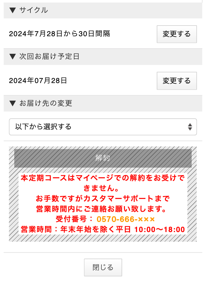 | 定期コース解約について | ■定期コース解約について 解約につきましては、WEB(マイページ)から24時間365日対応可能です。 商品お届け時に同梱されるお届け明細書に記載された次回お届け予定日の 7 日前までに、マイページからお手続きをお願いします。 また、下記受付時間内であればお電話(0570‐666‐408)でもお受け付けしております。 ※定期購入のご契約につきましてはお客様がご解約のお手続きを完了しない限り自動継続となりますので予めご了承下さい。 ※次回商品お届け予定日の 7 日未満の場合、既に次回お届け商品の発送手配中のため、解約お手続きができません。その場合には、次回商品お受取後、ご解約手続きをお願いします。 マイページからの解約方法【PCの場合】※次回お届け予定日の7日前までに解約をお願いします。
